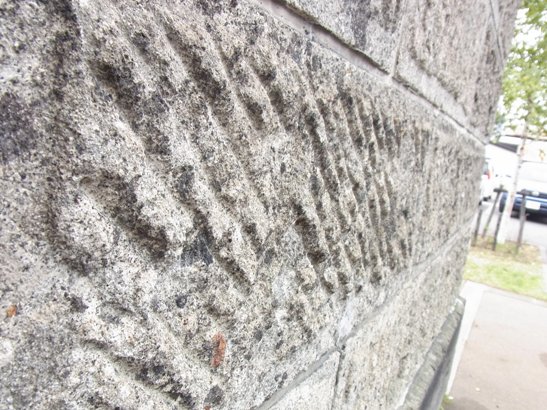 雨に濡れ光る彫刻とのコントラストが、